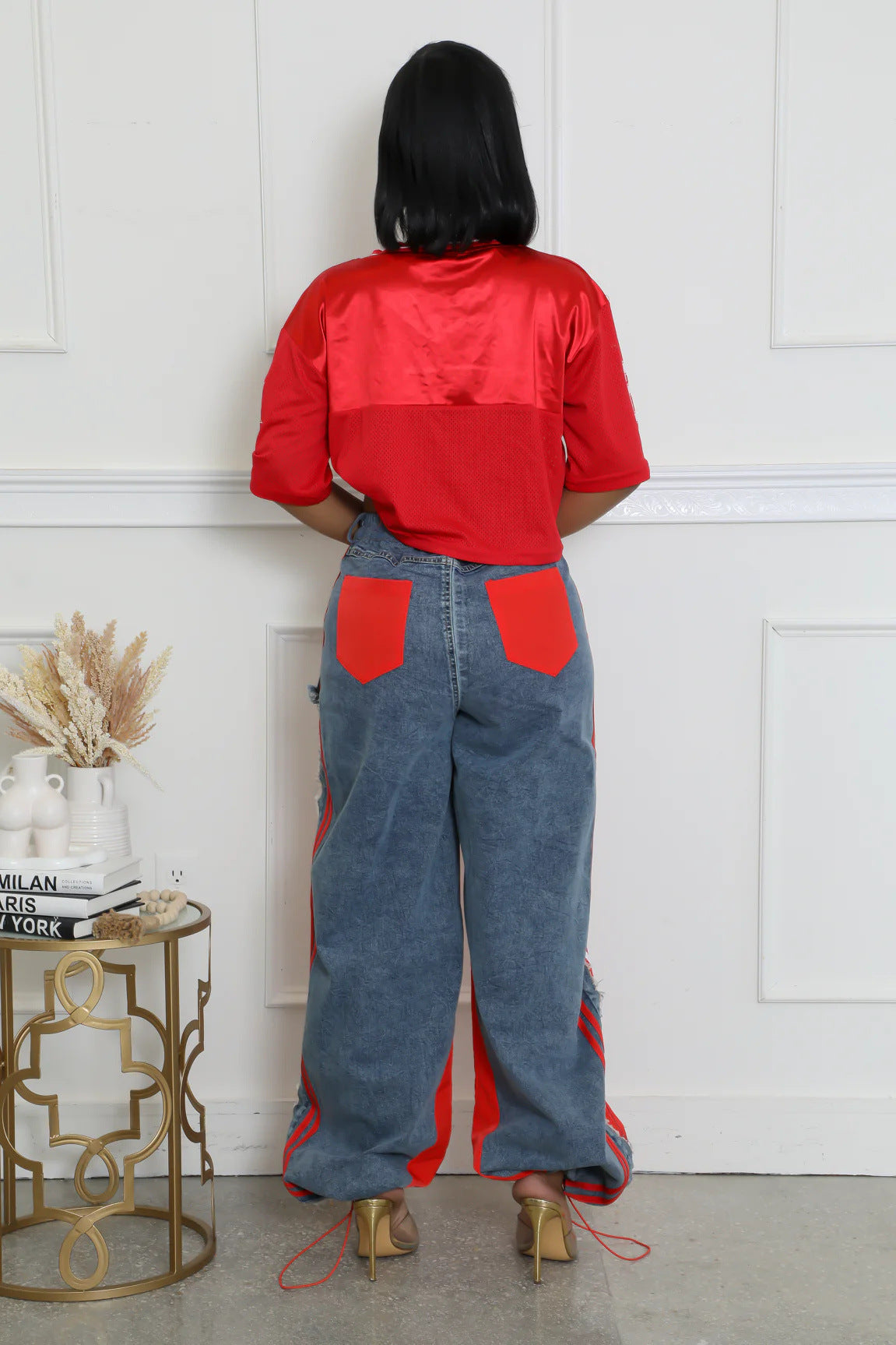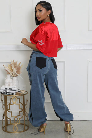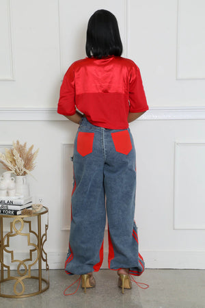 Girl, these Bold Fusion Trousers are fire! That red and denim mix with sporty stripes and frayed edges? Edgy, wide, and flowy—perfect for slayin’ in heels. A total vibe, no cap!