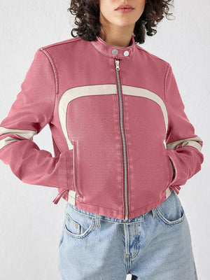 Contrast color stitching leather jacket