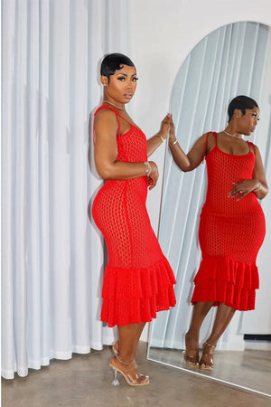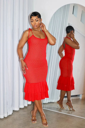 The Donatella Midi Dress is your new go-to for a playful and stylish look. Crafted with an open-knit crochet design, slim-fit silhouette and tiered ruffle hem with lining, this dress is both chic and comfortable. Plus, the adjustable tie straps add a touch of personalization. Perfect for any occasion!