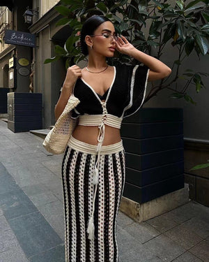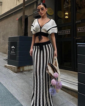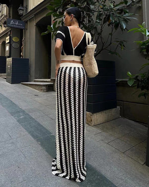 The Knit Set is the perfect blend of chic and comfortable. The cropped top features a stylish tie detail at the front, adding a playful touch to its sleek design. Paired with this top is a flattering striped maxi skirt that gracefully skims the floor, creating a long, lean silhouette. The soft knit fabric ensures all-day comfort, making this set ideal for both casual outings and dressed-up occasions. Whether you’re heading to brunch or a beachside dinner, the Knit Set effortlessly combines elegance with ease.